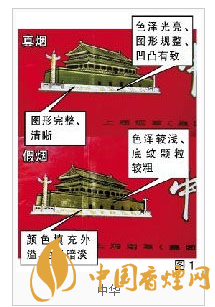 真品“中華”條包裝透明紙由于摩擦系數低,手感光滑;而假煙摩擦系數大,滯手,光澤差。真品天安門圖案圖形完整、清晰,色澤光亮、圖形規整、凹凸有致。假冒“中華”天安門圖案顏色填充外溢、色澤暗淡,色澤較淺、底紋顆粒較粗。假“中華”有時會使用回收的舊條盒,邊角處往往有磨損和玷污痕跡,且有兩次粘封或拆后封痕跡。