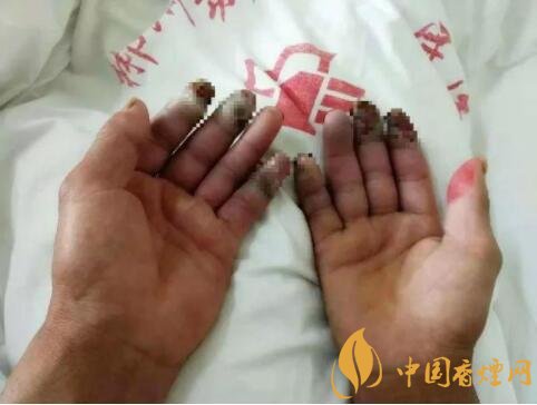 今年8月,谷某雙手手指開始出現間歇性疼痛。起先,他還以為是痛風,沒太在意,只是在當地醫院配了些治痛風的藥。兩個多月后,疼痛明顯加劇,晚上睡覺時特別疼,整夜整夜地疼,需要靠吃止痛藥才能入睡,慢慢手指遠端出現發黑,患者家人這時很重視,帶患者跑了三家醫院,確診為"血栓閉塞性脈管炎"。入院前,止痛藥已經完全起不了作用,整夜都不能睡,痛得大汗淋漓,一雙手,要時時刻刻泡在冷水里面,拿出來時要用嘴巴吹風,時時刻刻抖動雙手,緩解疼痛,一副痛不欲生的樣子。