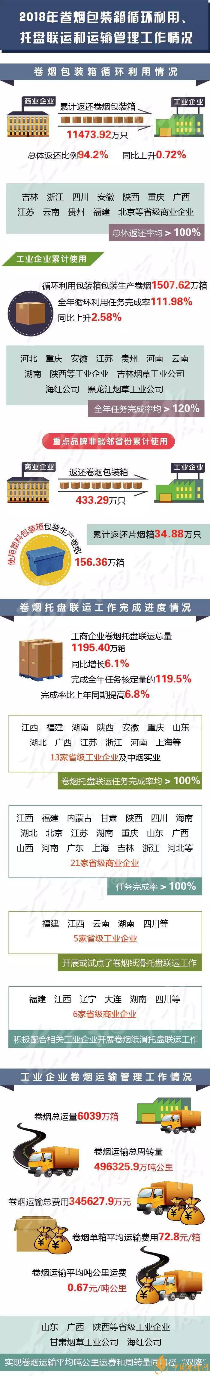 1月29日,國家煙草專賣局通報了2018年度卷煙包裝箱循環利用、卷煙托盤聯運及卷煙運輸管理工作情況(一圖速覽↓↓↓)。