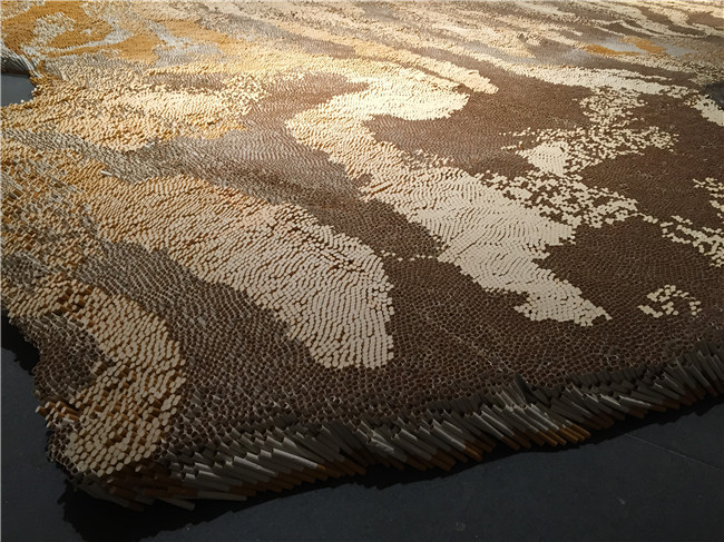 這件巨大而厚實的“虎皮地毯”鋪陳,是由50萬支重達440磅的香煙按照特殊的排列組成的驚人之作。為了突出全球貿易、包裝和人們是如何被致命的吸煙習慣所誘惑,56歲的徐冰經過十年探索花上十年的時間去制作……,最終創作出此作品。