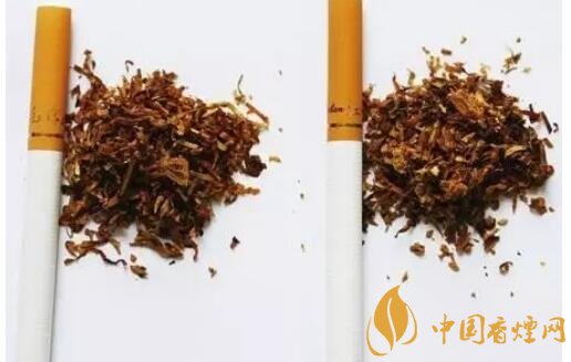 假煙煙支過濾嘴較短,長度約為20mm,制絲工藝粗糙,色澤發暗無光澤、煙絲中含碎末較多,大量梗絲未經過膨脹處理,無造紙法再造煙葉,與真品特征存在明顯差異。