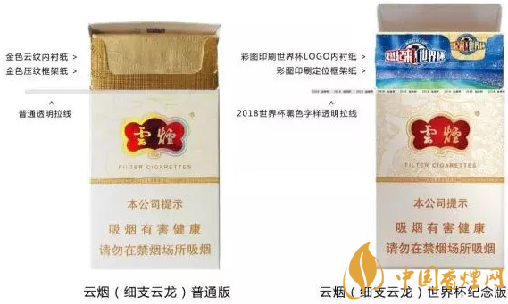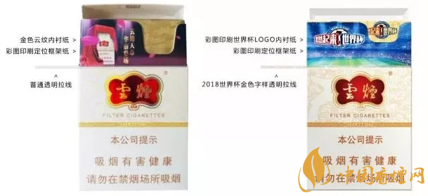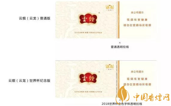 大家可能也了解國產中高檔香煙價格表和圖片,云煙占據主要市場。本次世界杯版對以下產品的條盒、小盒進行了局部改版調整,具體調整:小盒翻蓋內定位卡紙印刷世界杯元素、小盒內襯紙彩圖印刷世界杯元素、小盒拉線增加“2018世界杯”金色字樣、條盒拉線增加“2018世界杯”金色字樣。下面一起來看看細節對比圖吧。
