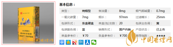 | 類型 :烤煙型 | 焦油量 :8mg | 煙氣煙堿量 :0.7mg | 一氧化碳量 :7mg |