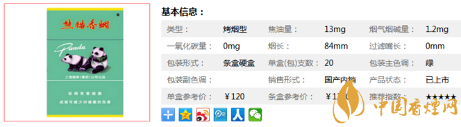 熊貓典藏版堅持采用綠色環保材料,香料采用高級天然香料。30mm加長煙支過濾嘴首創鼻祖。堅持200:1手工精選原料工藝,品質堪稱卷煙皇冠上的明珠。下面我們一起來看熊貓典藏版的參數信息:焦油量:13mg 煙堿量:1.2mg 一氧化碳量:12mg