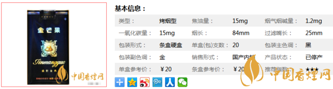 金芒果盛世金典算是金芒果系列里最好的煙了,外包裝漂亮,內涵高雅,讓人覺得很上檔次!煙支我覺得味道還可以,比較有香氣,口味醇和,沒有其他味道,對得起這個價位。經香煙網小編市場調查金芒果盛世金典售價為20元/包。