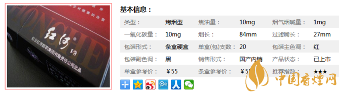 云貴高原獨有的高品質煙葉,經由模塊化設計,清甜增香板組合疊加的調香技術,增強卷煙的清甜香韻,30mm獨特濾嘴設計,內置獨特溝槽設計,有效降焦減害。下面我們一起來看紅河硬v8的參數信息:焦油量:10mg. 煙堿量:1mg. 一氧化碳量:10mg.
