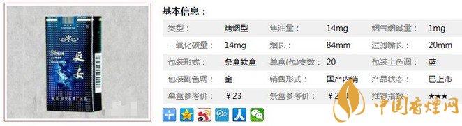 | 煙長:84mm | 過濾嘴長:20mm | 包裝形式:條盒軟盒 | 單盒(包)支數:20 |