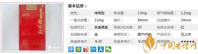 | 煙長(zhǎng):84mm | 過濾嘴長(zhǎng):24mm | 包裝形式:條盒硬盒 | 單盒(包)支數(shù):20 |