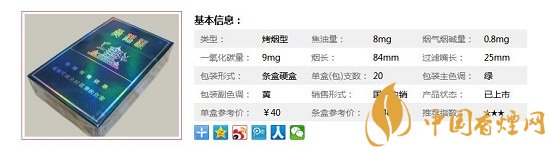 | 類型 :烤煙型 | 焦油量 :8mg | 煙氣煙堿量 :0.8mg | 一氧化碳量 :9mg |