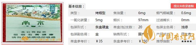 類型 :烤煙型 焦油量 :6mg 煙氣煙堿量 :0.6mg 一氧化碳量 :5mg