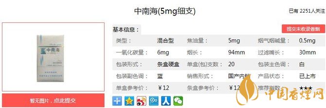 中南海5mg細支香煙焦油應該算是非常低了,采用中草藥添加技術,精選國內優質晾曬煙煙葉,香氣濃郁、諧調,一款不錯的女士細支煙。經香煙網小編市場調查中南海5mg細支售價為12元/包。