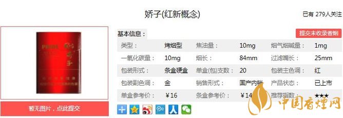 香氣清雅,清甜帶茶香香韻,成熟的煙草本香底蘊突出,香韻豐富而諧調;煙氣細膩綿厚,口感舒適,回味悠長。充分體現了高檔卷煙的和諧之美,帶給人以自然的享受與滿足。經香煙網小編市場調查嬌子紅新概念售價為16元/包。