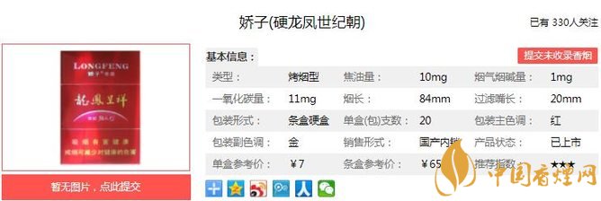 嬌子硬龍鳳世紀朝是一款中價位的老牌產品,采用現代的設計手法表現品牌傳統內涵的時代意義。保持了嬌子系列一貫的優良品質,價位適中,口感醇厚,經香煙網小編市場調查嬌子硬龍鳳世紀朝售價為7元/包。