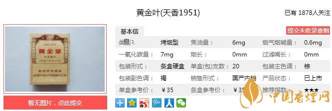 黃金葉天香1951從字面上理解和其本色本香的煙味應(yīng)該是向創(chuàng)牌于1951年“黃金葉”品牌的烤煙傳統(tǒng)致敬,自然本香、尊貴天香、高香低害、舒適輕松、本色包裝、傳承經(jīng)典,古色簡約的包裝風(fēng)格同時(shí)也是對(duì)于經(jīng)典的傳承。經(jīng)香煙網(wǎng)小編市場調(diào)查黃金葉天香1951售價(jià)為35元/包。
