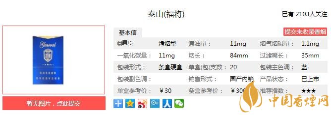 泰山福將煙支長(zhǎng)84mm,過(guò)濾嘴長(zhǎng)35mm,煙嘴的顏色和煙盒一致,長(zhǎng)35MM,僅有將軍和7顆星的圖案,設(shè)計(jì)上簡(jiǎn)約,但是又顯得不簡(jiǎn)單,干凈利落。煙絲淡黃,彈性好,填充略有一些松,嗅香就是煙草本味。下面我們一起來(lái)看泰山福將的參數(shù)信息:焦油量:11mg 煙堿量:1.1mg 一氧化碳量:11mg