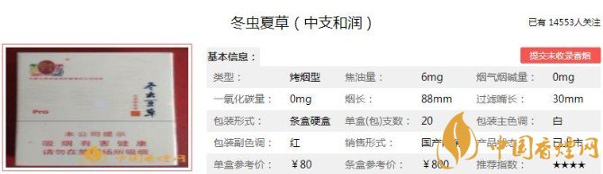 煙嘴圖案和包裝圖案高度統和諧統一,煙支香料味蠻重,稍有一點點藥材的味道,但是這款香煙的過濾嘴確實算比較長的。同時煙支采用高效降焦卷煙紙、高效截留功能濾棒等多種減害降焦材料與技術,全面降低香煙的焦油。下面便是冬蟲夏草(中支和潤)的基本參數:焦油量:6mg 煙堿量:暫無 一氧化碳量:暫無.
