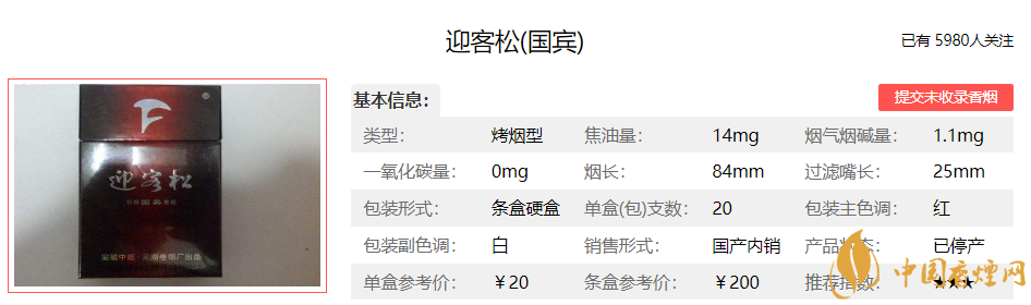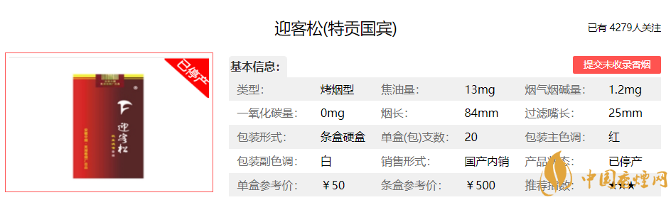 選用享譽中外的優質煙葉作為配方主體,產品香氣濃郁,煙氣厚實自然,口感舒適干凈。產品自然醇化,秉承迎客松產品一貫的優良品質,精心配制,獨具香韻。即保持了迎客松優美的清香風格,又賦予成熟煙草的焦甜芬芳,香氣韻味豐富,渾然一體,著重體現優雅細膩、醇和自然、清新宜人的特點,口感舒適,回味甘甜,勁頭適中。經香煙網小編市場調查迎客松特貢國賓售價為50元/包。