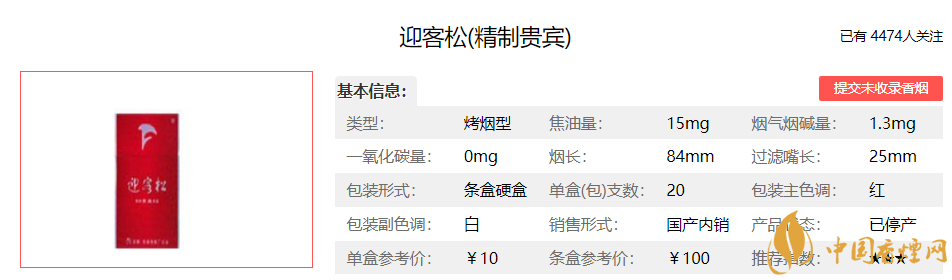 迎客松(精制貴賓)煙是安徽中煙工業有限責任公司旗下品牌迎客松香煙推出的一款焦油含量14mg的烤煙型香煙(俗名:Yingkesong Guibin)。 產品精選進口煙葉和 優質云南煙葉作為配方主體。產品香氣清雅飄逸,口感清爽舒適,余味干凈。