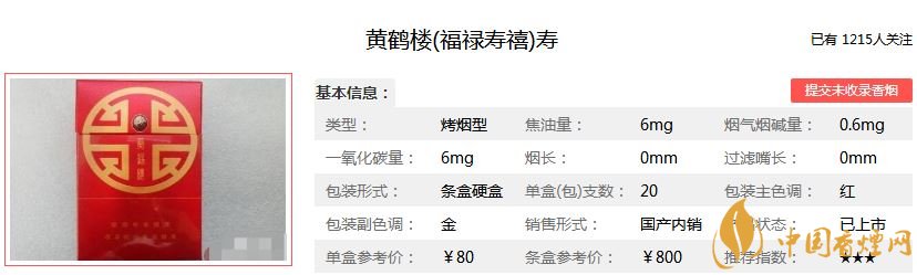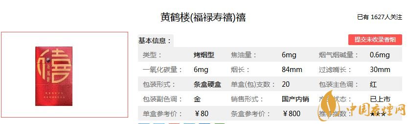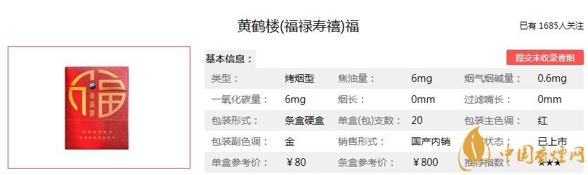 福祿壽喜代表著吉祥安康的寓意,黃鶴樓香煙為此開發出的黃鶴樓福祿壽喜香煙,福代表幸福美滿;祿代表升官發財;壽代表健康長壽;喜代表喜事。黃鶴樓福祿壽喜價格及參數如下: