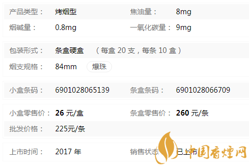| 類型 :烤煙型 | 焦油量 :8mg | 煙氣煙堿量 :0.8mg | 一氧化碳量 :9mg |