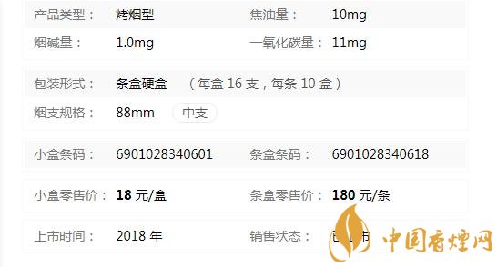 | 類型 :烤煙型 | 焦油量 :10mg | 煙氣煙堿量 :1mg | 一氧化碳量 :11mg |
