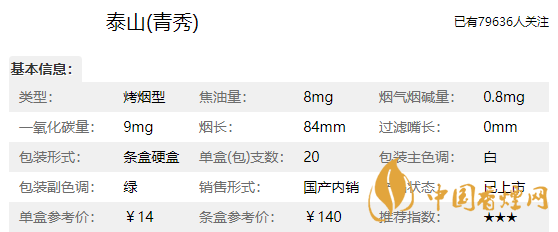 泰山青秀煙長84mm,屬于低焦油系列香煙,煙氣較淡,入口輕柔,煙勁挺小的外觀很大氣到喉嚨里后也很順暢在這個價位里是挺不錯的一款煙了。下面我們一起來看泰山青秀的參數信息:焦油量:8mg煙堿量:0.8mg一氧化碳量:9mg。