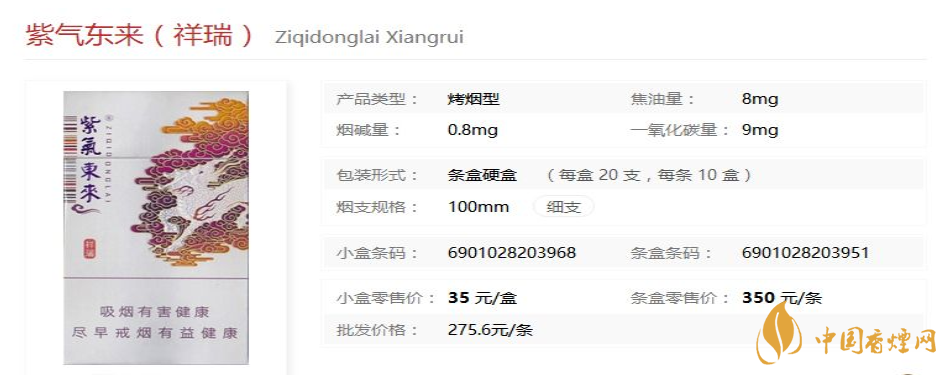 紫氣東來祥瑞煙支長100mm,過濾嘴長35mm,定位在細支煙品類。通過采用低溫保香,多級復配等特色工藝,使產品煙草本香更加突出,抽吸的均勻性更加穩定,使消費者在享受煙草香氣的同時,又能體味自然舒適的感覺。下面我們一起來看紫氣東來祥瑞的參數信息:焦油量:8mg煙堿量:0.8mg一氧化碳量:9mg。