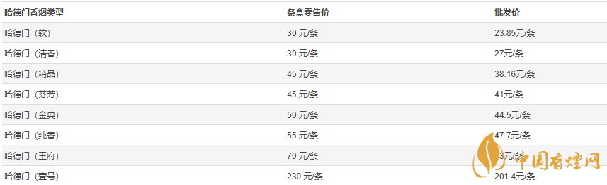 哈德門產品系列共有八種香煙產品,其中除了哈德門(壹號)每條零售價是230元之外,其他的七種香煙產品,條盒零售價基本都是在30至55元之間,由于每條10盒,所以,每小盒的價格即在3至5元左右??梢?,哈德門香煙的價格是比較低廉的,也符合它“民品之名品”的稱號。