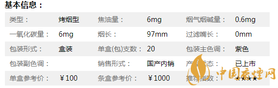 類型 :烤煙型 焦油量 :11mg 煙氣煙堿量 :1.1mg 一氧化碳量 :13mg