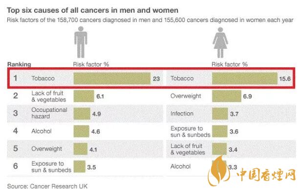 我國煙草生產量和消費量穩居世界第一,并擁有3億以上的煙民。雖然“吸煙有害健康”的標語早已經出現在大街小巷,但很多朋友只是莞爾一笑。其實這口號并非危言聳聽,煙草使用占所有死亡危險因素的第2位。男性32.7%的癌癥死亡歸因于吸煙,遠高于女性的5.0%。