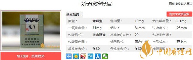 嬌子寬窄好運煙支長:84mm,過濾嘴長:34mm,采用超微植物顆粒復合濾棒,提升煙草焦甜本味,更增獨特復合香韻。下面我們一起來看嬌子寬窄好運的參數信息:焦油量:10mg 煙堿量:1.1mg 一氧化碳量:11mg