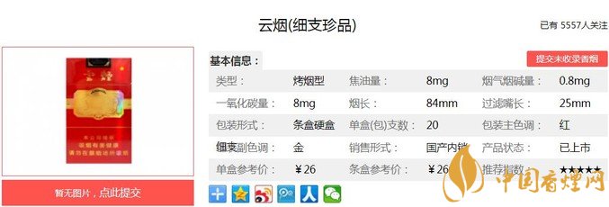 云煙細支珍品依托云南最好的煙葉品質,傳遞自然生香。云南優越的自然環境培育出國內最優質煙葉品種之一的“紅花大金元”,入選“金腰帶”主配方。經香煙網小編市場調查云煙細支珍品售價為26元/包。
