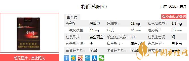 為了保證卷煙的香味品質,通過對所有倉儲煙葉中的高檔原料進行分析化驗和內在品質評定,選擇國內外香氣足、煙堿適中、焦油含量低的優質煙葉,精心配比,在化學成份比例協調的基礎上,保證其突出的香氣風格和特征。經測定,焦油和尼古丁的比值保持在10∶1左右的合理范圍,且焦油量進一步降低,煙氣更加柔和細膩。經香煙網小編市場調查利群軟陽光售價為36元/包。