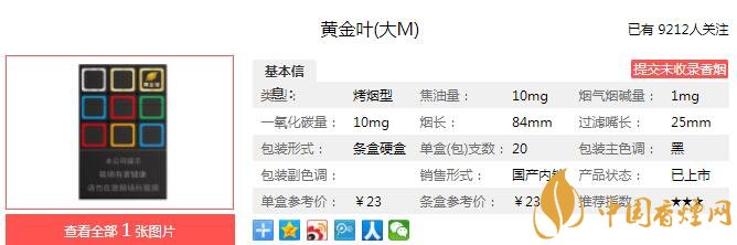 采用綠色天然鍍陶功能包裝,雙向保濕,增潤保香。萃取紅橙、薄荷原液精華,內含冰橙爆珠,絲絲清涼,淡淡橙香。過濾嘴有多種顏色,把所有煙支取出按照色譜排列,漸變的彩虹色賞心悅目。經香煙網小編市場調查黃金葉大M售價為23元/包。