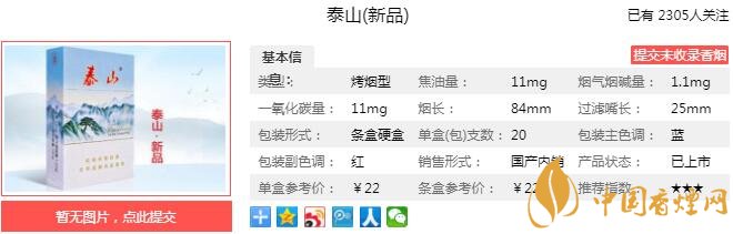 泰山(新品)卷煙精選優(yōu)質(zhì)進(jìn)口煙葉,采用純天然香精香料,香氣清雅濃馥、豐滿、諧調(diào)、吸味純正、口感細(xì)膩、余味純凈舒適,“清新自然、至尊泰山”是卷煙中的高檔精品。經(jīng)香煙網(wǎng)小編市場調(diào)查泰山新品售價為22元/包。