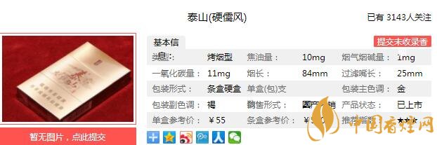 泰山硬儒風煙支長84mm,過濾嘴長25mm,“儒風泰山”的配方和調香技術嫁接了緩解精神壓力的“香薰”機理,發揮SPA功效創造出一種“心悅神定”的氣氛。下面我們一起來看泰山硬儒風的參數信息:焦油量:10mg 煙堿量:1.0mg 一氧化碳量:11mg