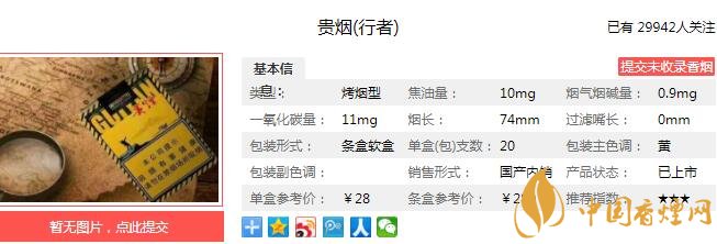 “貴煙(行者)”是“貴煙”旗下的首款短支爆珠煙。煙香不濃不淡,煙草的清香味道,醇正而清新。黃黑配色的醒目包裝、斜條紋帶來的西部公路感,都在把人引到一種豪放、自由的感覺之中。經香煙網小編市場調查貴煙行者售價為28元/包。