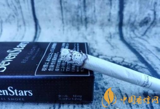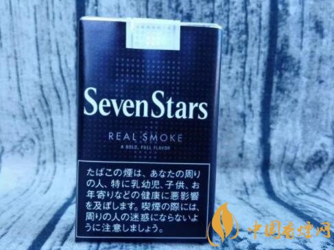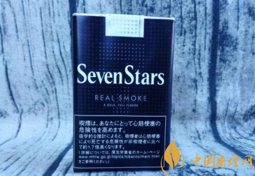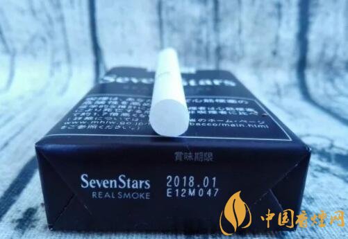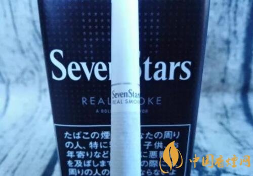 煙盒的正反及左右兩側均以白色的小五角星為圖案,橫平豎直地排列開來。與其它Seven Stars版本一樣,位于煙盒正反兩面中間都有阿拉伯數字“7”的標識。REAL SMOKE,直譯成中文是“真煙,真正的香煙”之意。A BOLD FULL FLAVOR,中文意思是“煙味十足”。綜合意思,是說此款日稅黑七星的品質之高。