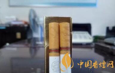 又是款淺金色調(diào)為主、修飾以深色金邊框的包裝設(shè)計(jì),有些像芙蓉王硬黃的造型。圓圈中的金龍?jiān)煨停袷浅橄螽嫹ǖ模瑳]有真龍或者其它帶有龍的圖案香煙的豐滿與霸氣。
