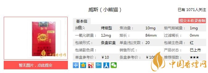 威斯小熊貓的前身是紅河小熊貓世紀風,紅河小熊貓世紀風的前身是小熊貓軟紅世紀風。品牌是一變再變,人氣卻一降再降,現在也是風光不在了。經香煙網小編市場調查威斯小熊貓售價為10元/包。