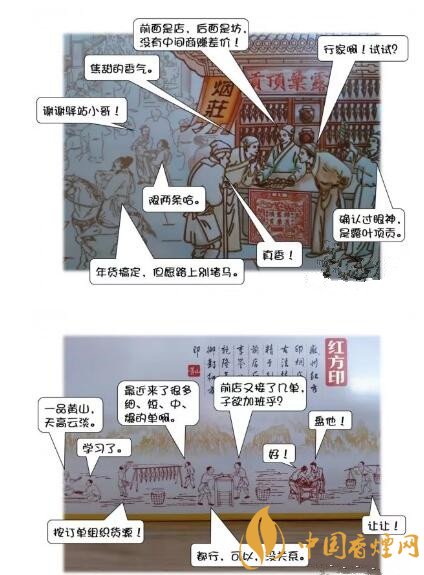 細看,正面的“前店”是一條古徽州商業街的圖樣,人頭攢動、熙熙攘攘,掛著“露葉頂貢”招牌的紅方印煙莊占據了C位,門口的“文幫”掌柜手持一片煙葉接受眾人圍觀;背面的“后坊”,則描繪了“武幫”的手工匠人們曬煙、制絲的勞作場景。可惜圖案只能繪色、不能繪聲,假如身臨其境,會聽到什么樣的聲音呢?惡搞一下吧……