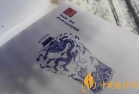 先來欣賞一下煙盒內里的包裝設計特點。向上掀開合蓋,會發(fā)現(xiàn)上蓋內里印有數(shù)條騰龍圖案,以及china瓷字樣。