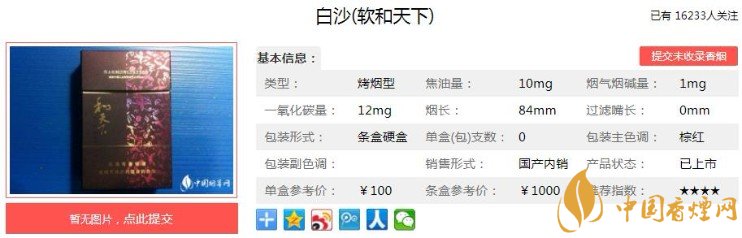 “白沙(軟和天下)在吸味、香氣與刺激性上的協調完美;煙嘴仍然采用了圓形鏤空煙嘴,長度37mm,樣式與硬和也是基本一樣,只是多出來一道金環。基本參數如下:焦油量:10mg