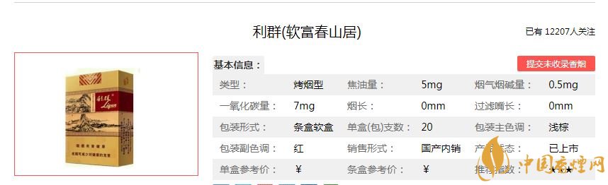 煙葉資源,秉承純煙葉打造,不添加任何香精香料,“”有“純天然、低焦低害”、“華夏第一支”的美譽。包裝設計上,無論是外包裝上還是煙支圖案,利群(富春山居)都完美展現了傳統文化之美和人文氣息。以帶給目標消費人群“本色本香、自然純正”的高品質品吸感受。目前利群(富春山居)主要有軟包和硬盒兩種規格,零售價格均超過5000元一條,雖然價格高昂,大多數煙民都抽不起。