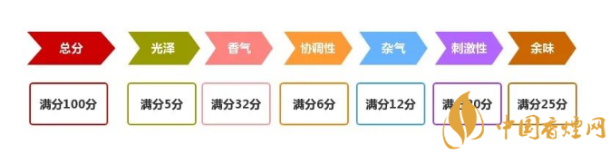 煙草行業對于成品卷煙明確的評價標準是百分制的感官評吸國標賦值法打分,質量評價指標由光澤、香氣、雜氣、刺激性、余味、協調6項指標組成,根據眼觀手觸吸食掌握的性狀打分,分值越高代表其品質越好。
