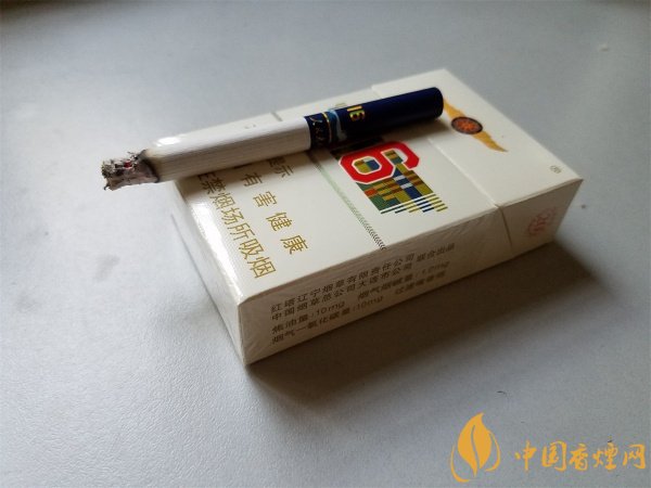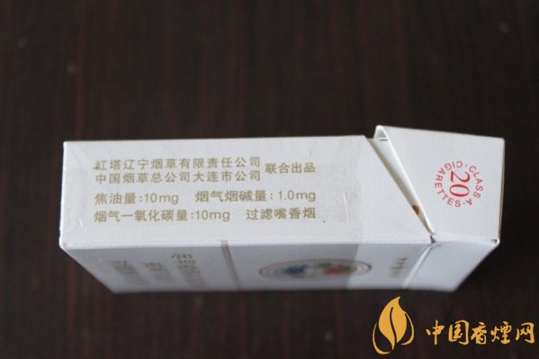 煙盒的右側注明了理化數值,標注著由紅塔遼寧煙草和在連公司聯合出品,焦油量:10mg、煙氣煙堿量:10mg、煙氣一氧化碳量:10mg,三個10的理化數值,讓人感覺它的協調性很好。