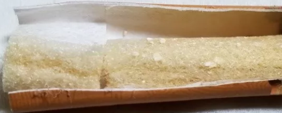 剖開濾嘴...是兩段式濾嘴,前段占據(jù)2/3,絲束里夾雜細(xì)碎的白色顆粒,想來是細(xì)微甜。濾嘴有降焦孔,基本開在了整個濾嘴的中段位置。從兩段絲束的顏色變化來看,基本均勻,略微變成了淡黃色。看來煙支的延燒性、空氣的介入等調(diào)節(jié)得都比較理想。香之物。