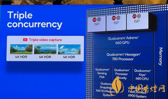 驍龍888移動平臺內封裝全新的Qualcomm Spectra 580 ISP,也就是圖像信號處理模塊,該模塊實際上共有三個ISP(上代是兩個),能夠以每秒處理27億像素的速度,支持三個攝像頭的并發拍攝。