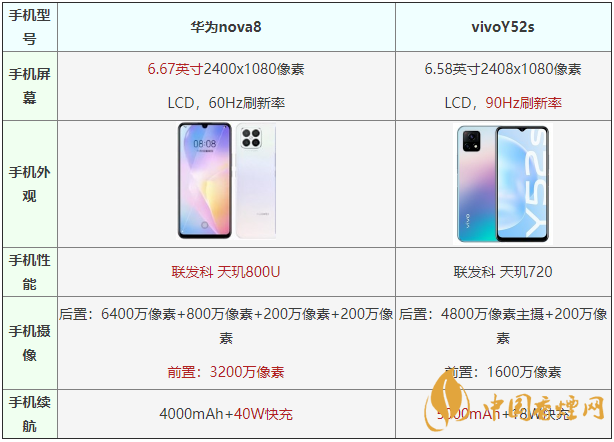華為nova8和vivoY52s哪款手機更好 參數配置對比