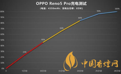 除了超長續航之外,OPPO Reno5 Pro還加入了65W超級閃充技術,進一步提升快充體驗。從實際測試結果來看,如果從零開始進行充電,OPPO Reno5 Pro只要5分鐘就能充電24%,10分鐘就能充電46%,充到100%只需要28分鐘,充電速度非常快。即便是手機沒電了,OPPO Reno5 Pro也能快速回血,一會功夫就能完成充電工作,日常使用更方便。